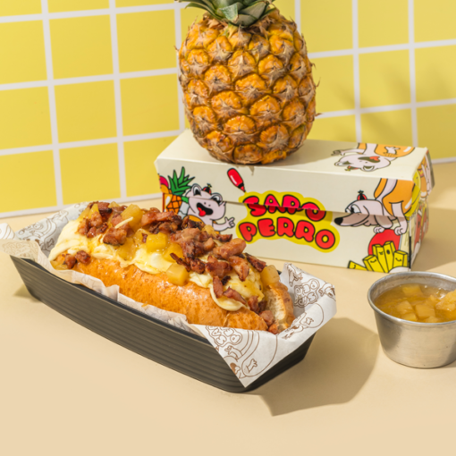 Salchicha americana, pan artesanal brioche, extra queso doble crema (3 tajadas), salsa de piña, salsa crema leña, papita crunchy, tocineta en trozos y cubitos de piña caramelizada.
